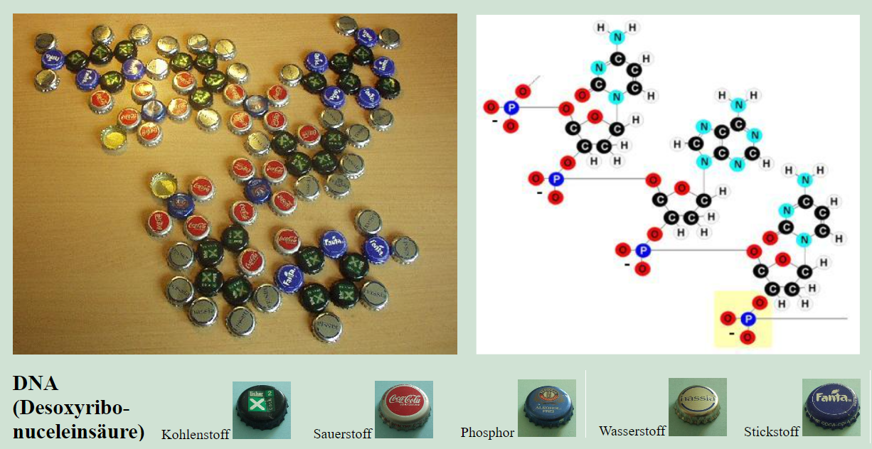 Die DNA (deoxyribonucleic acid) oder DNS (Desoxyribonucleinsäure) wurde bereits 1932 als wirksamer Bestandteil der Chromosomen bzw. des Kernchromatins (siehe SPRINGER 2018) angesehen. 1953 erfolgte die Entschlüsselung ihres strukturellen Aufbaues und ihre Nachbildung im Modell durch James W Watson und Francis Crick (vgl. WIKIPEDIA 2007).