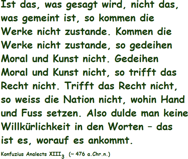 Eine Ursache ist der verantwortungslose Umgang mit Metaphern. Er ist deshalb verantwortungslos, weil damit bewußt hingenommen wird, daß sie von vielen Menschen nicht verstanden werden zumal dann, wenn darüberhinaus die Worte nicht stimmen. Denn wenn das Gesagte nicht das Gemeinte ist, weiß das Volk nicht, wohin Hände und Füße setzen (KONFUZIUS <476).